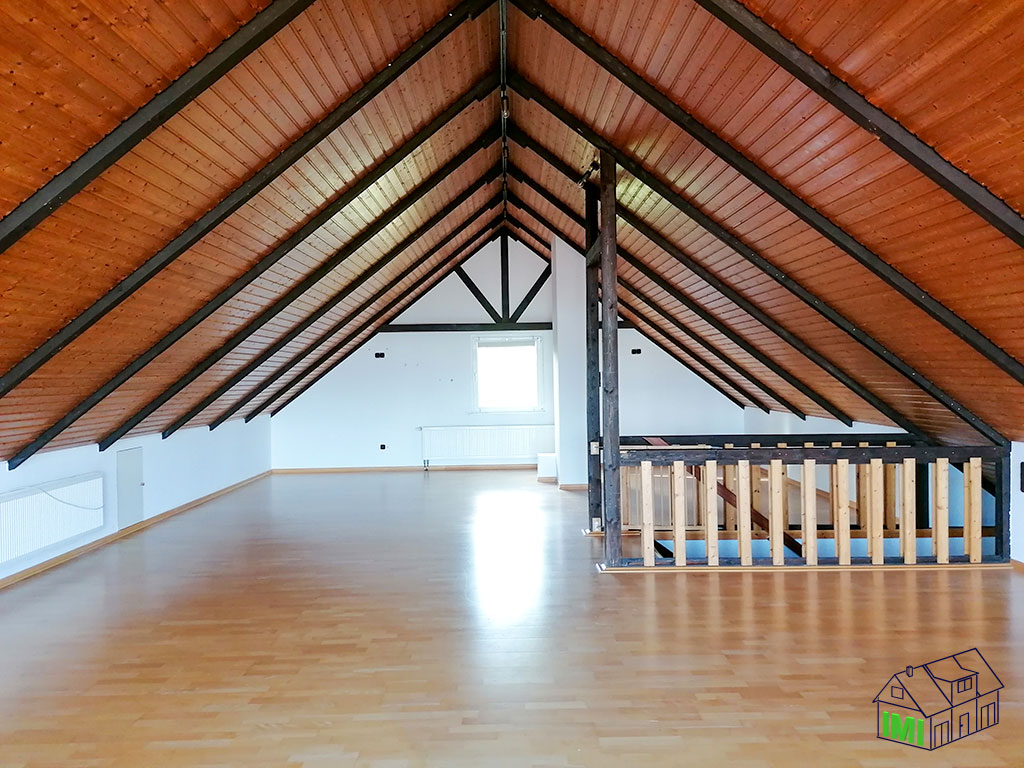 Der Haupteingang auf der Rückseite des Hauses führt in einen kleinen Flur mit angrenzendem Gäste-WC und Zugang zum ausgebauten Dachgeschoss sowie in den Hauptflur der Wohnung. Das Dachgeschoss ist vollständig ausgebaut und wurde in offener Bauweise gestaltet. Der große, lichtdurchflutete Raum bietet vielfältige Nutzungsmöglichkeiten, z. B. als Studio, Arbeitsbereich, Hobbyraum oder zusätzliches Schlafzimmer. Vom Hauptflur der Wohnung gelangt man weiterhin in eine offene Küche mit Essbereich, in das großzügige Wohnzimmer mit Zugang zum Balkon, in ein großes Badezimmer, einen Abstellraum und in insgesamt drei Schlafzimmer. Ein Schlafzimmer auf der Westeseite des Objektes verfügt über einen weiteren Zugang auf eine großzügige Terrasse.